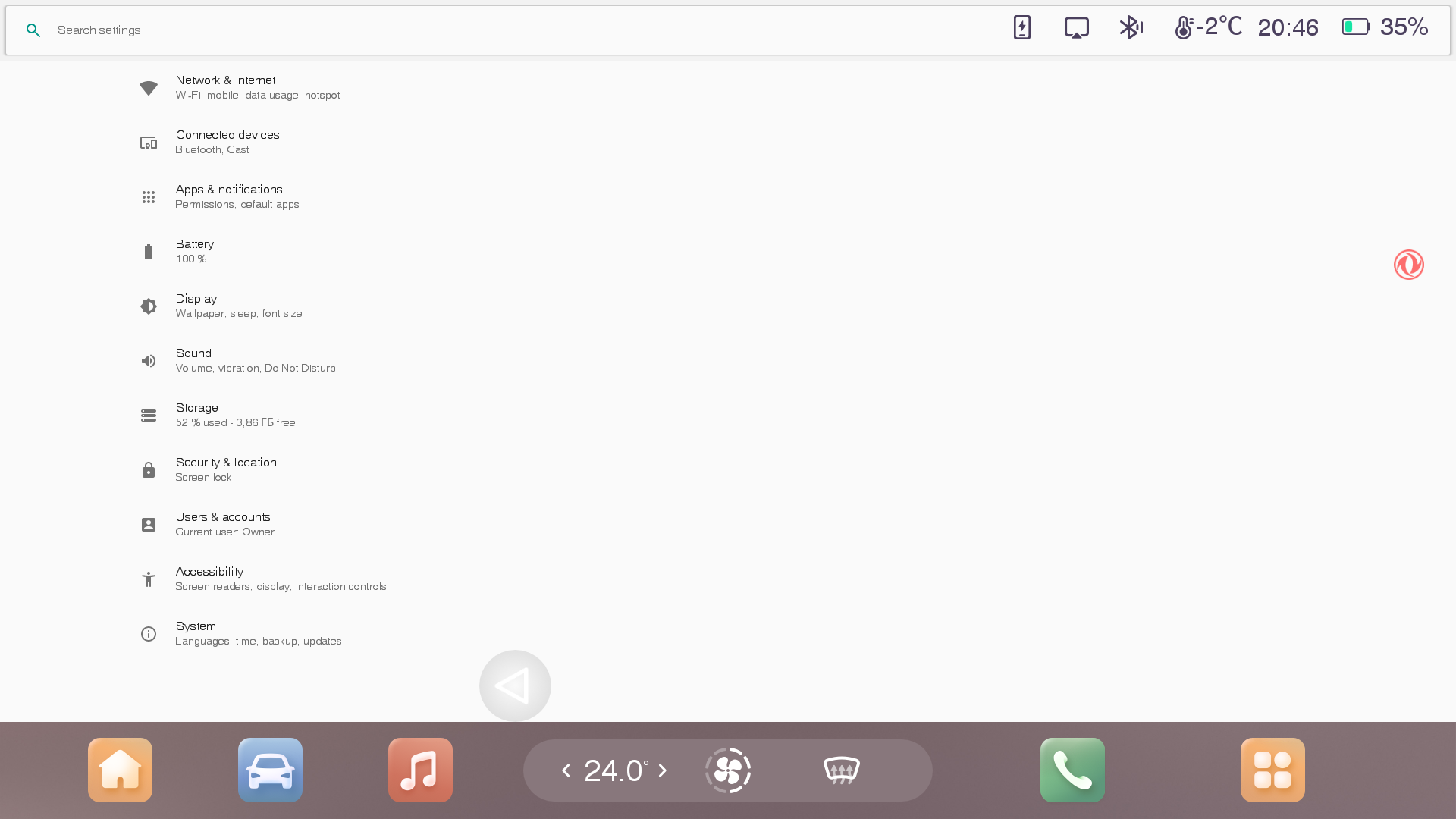 Войти в системные настройки Android планшета ГУ можно, запустив приложение Settings из списка приложений. Настройки выглядят стандартно для андроид-устройства с тем лишь отличием, что большая их часть не работает.